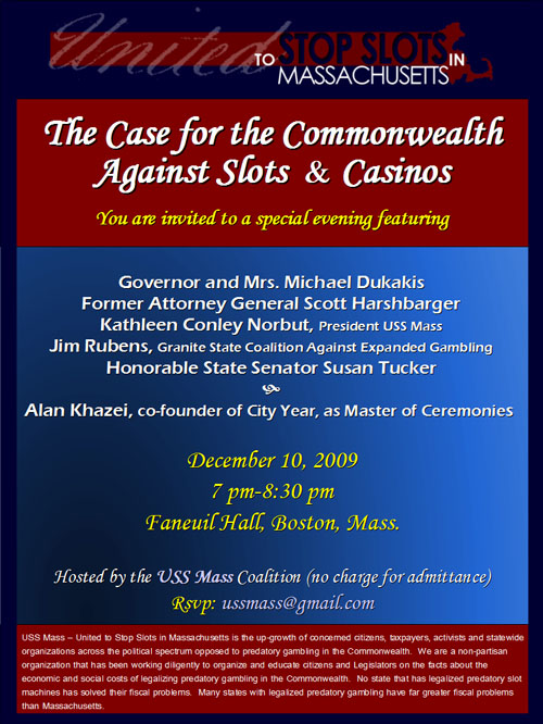 USS-Mass President Kathleen Norbut and Ed Harrison (Chairman, Western MA Casino Task Force)will be members of the panel. The public is invited to attend.
